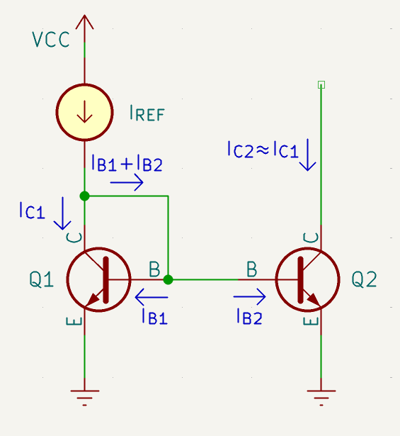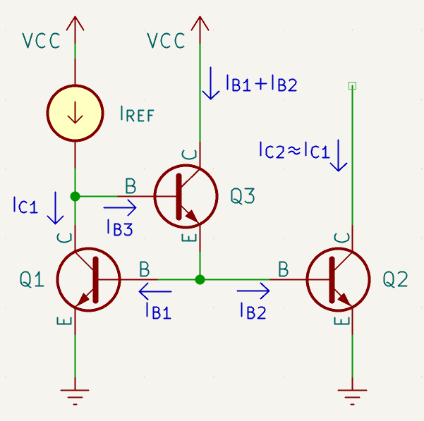 You might notice there is a transistor wired in between the collector and base of the transistor in our reference branch. That’s because I’ve implemented a current mirror technique known as base-current compensation. The new transistor is responsible for supplying the base current to the mirror transistors. In doing so, it reduces the error between the copied current branches and the reference branch by a factor of its beta.