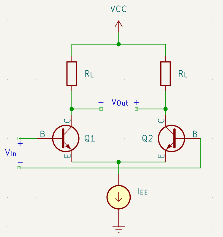 A differential pair is a differential amplifier which consists of two input transistors ending in a shared tail. Unlike single ended amplifiers, differential amplifiers take in two inputs and amplify the difference between them. The differential pair’s ‘tail’ is typically biased with a constant current and inputs are supplied at the base of either transistor. This difference in the input voltages causes the transistors to carry different amounts of current, however the sum of the current in either branch will always equal the bias current.