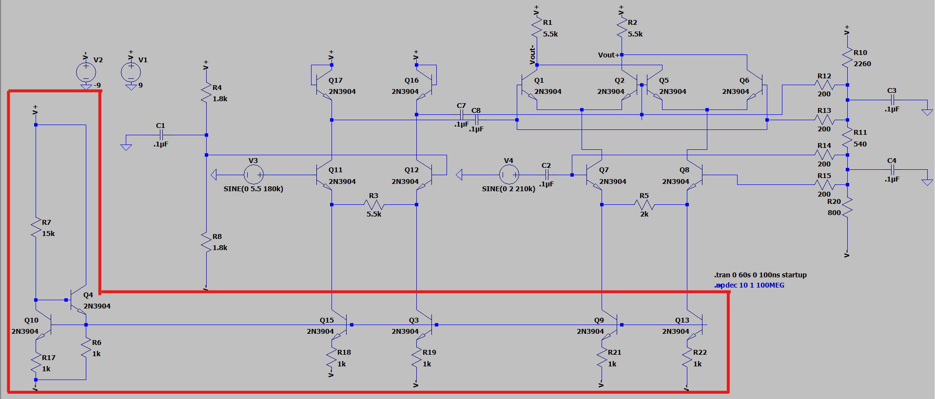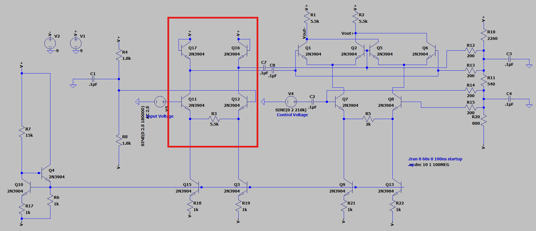 While our top differential pairs’ emitter voltage does not move appreciably, their collectors are tied directly to both $V_{out}$ and our load resistors. This means, similar to in the bottom differential pair, their collecter voltage moves in unision with their respective output node. This relation is described by $-I_{1,2}R_L$ where $I_{1,2}$ represents the current for each of the top two branches. We must bias the top level differential pairs so that even when an output node is at its minimum allowable value the transistors still maintain a $V_{CE}$ > 0.2 volts. In our case the maximum desired output swing is 11 volts. Adding 0.3 volts to ensure a $V_{CE}$ greater than 0.2v leaves us with a bias value of 11.3 volts below $V_{CC}$. Because our circuit runs on a ±9V supply this means the top differential pairs are biased at -2.3 volts.