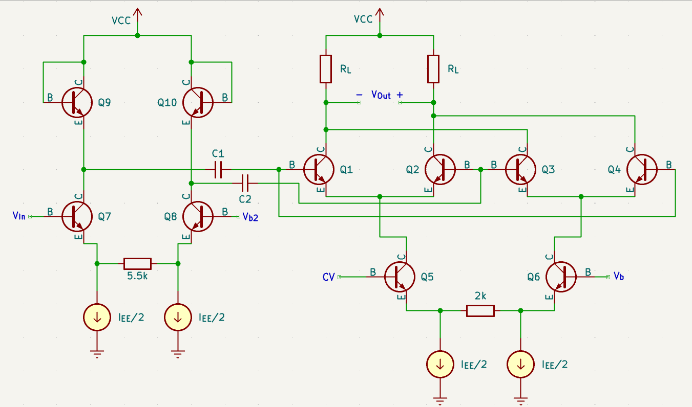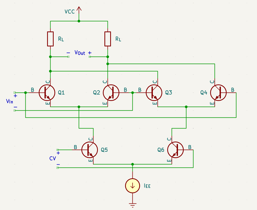 Where $R_C$ is the load resistance placed at the collector. The transconductance ($g_m$) of a transistor is found by $I_c/V_t$ where $I_c$ is the current through the collector of the transistor and $V_t$ is the thermal voltage, approximated at 25mV. These equations mean that we can vary the gain of our differential pair by varying the current through the transistors! If we increase the bias current the gm increases with it and as a result the gain does as well. Similarly, if we decrease the bias current, we can reduce the gain. This allows us to change the gain. While a simple differential pair would be a viable candidate to create a VCA, there is an alternative topology which boasts a better frequency response.