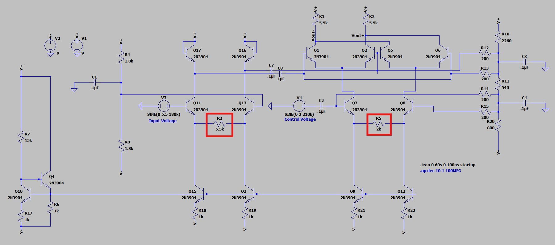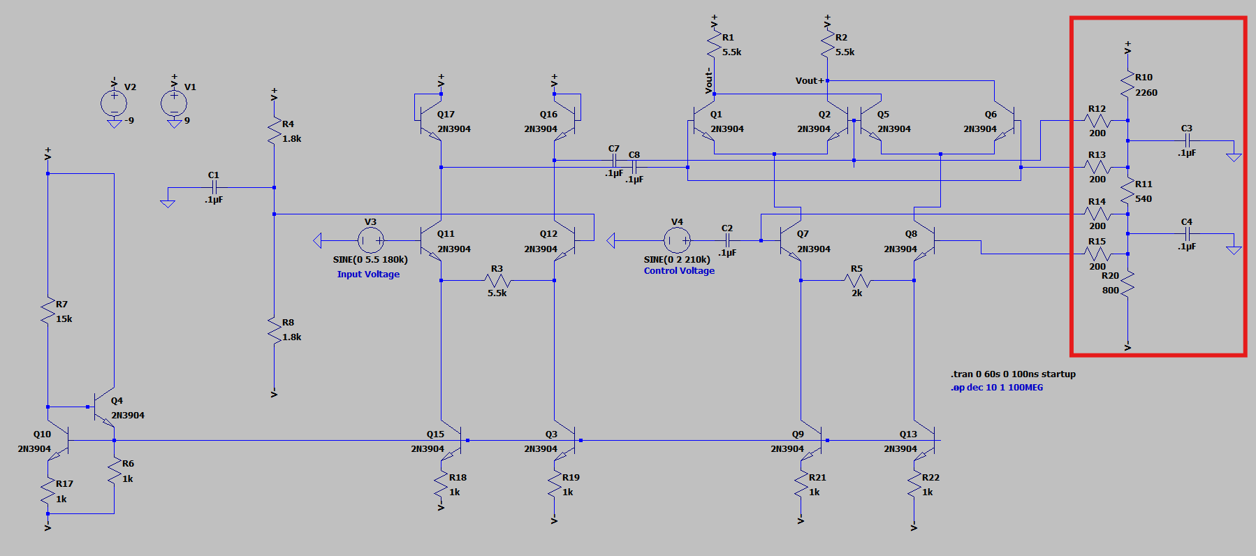 If emitter degeneration allows us to expand our input voltage range, why haven’t we used it for our top differential pairs? If you remember from when we determined the bias points for our transistors we found that because the base of the bottom pair’s transistors were being directly driven by the control voltage, the input range for the bottom pair had a one-to-one cost on the voltage headroom. While this was a feasible cost when it was just 4 volts, what about 11? Such a cost on headroom would only leave us with ±1 volts for our output signal. Pretty undesirable.
