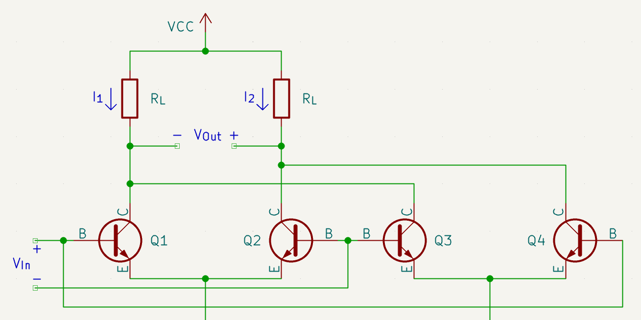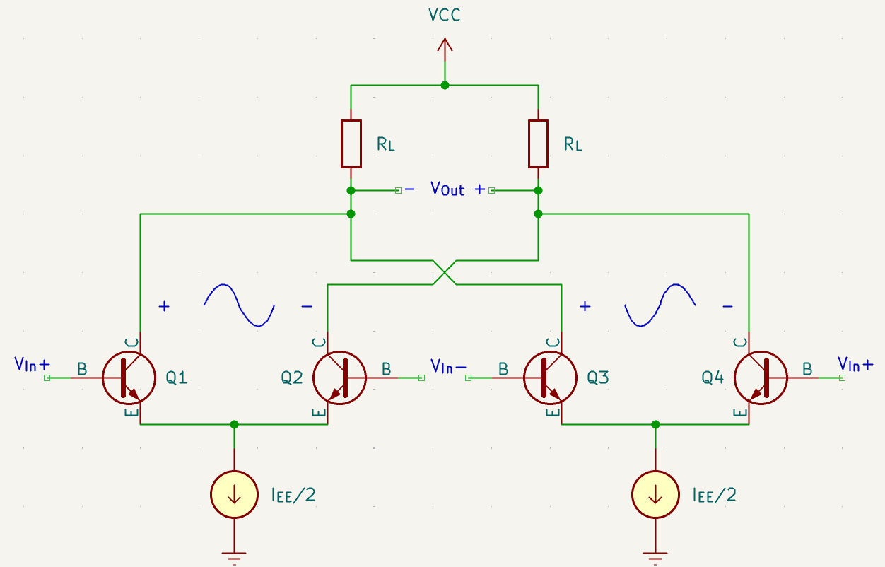 - The two pairs are wired inversely of each other. This means that for any given input differential, $V_{in}$, one pair will receive $+V_{in}$ and the other will receive $-V_{in}$.