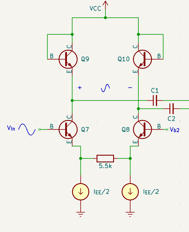 You may notice that sometimes the bottom ’tail’ of the differential pairs are split or joined throughout this point. They’re functionally equivalent to each other, although they respond differently to mismatch between components. The split style responds better to differential pair transistor mismatch which is why I’ve opted for it in the design.